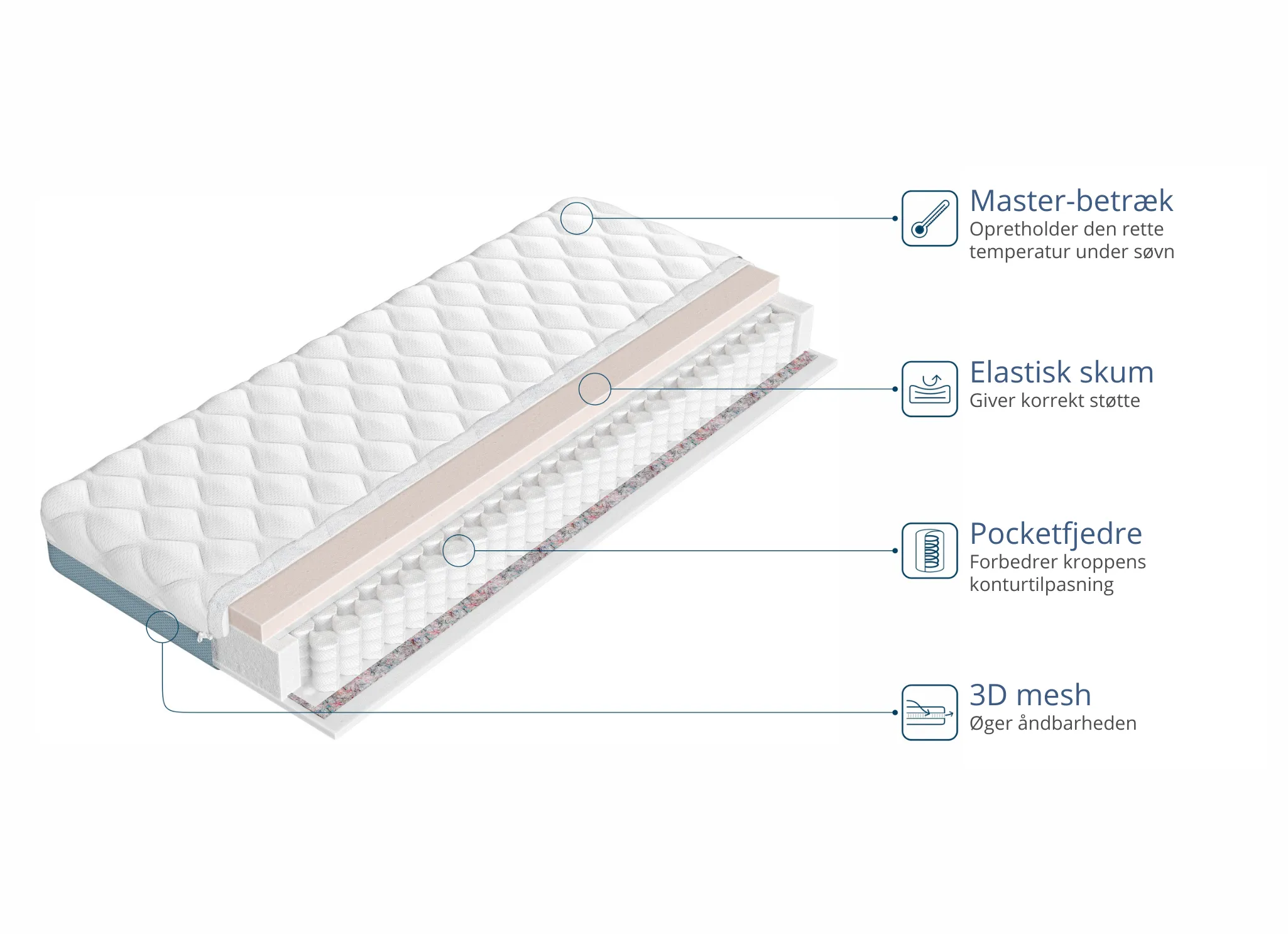 | Fyld | Betræk, stof Master + 3D-net 1 cm; Multipocketfjedre 8 cm; Filc; Polyurethanskum 4 cm |