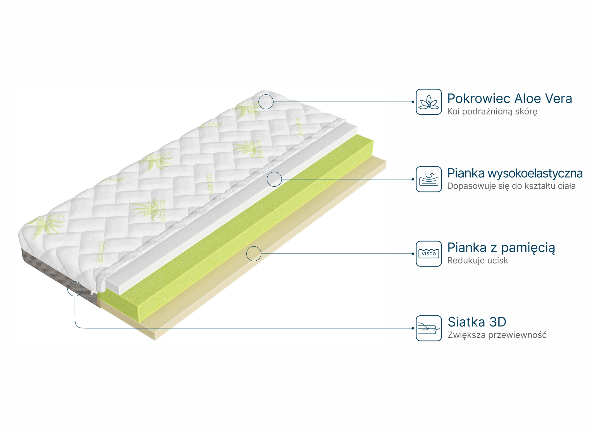 - Øverste del – et stof af aloe vera. Pleje af barnets hud? Ekstraktet af aloe vera, der dækker denne del af madrassen, er kendt for sine gavnlige virkninger på huden og er vores måde at minimere risikoen for irritation. Tilføj til dette et klimafiber, og du får en madras med et forbedret ventilationssystem. Overophedning af barnet om natten? Med FITTED madrassen vil dette problem ikke længere være en bekymring.