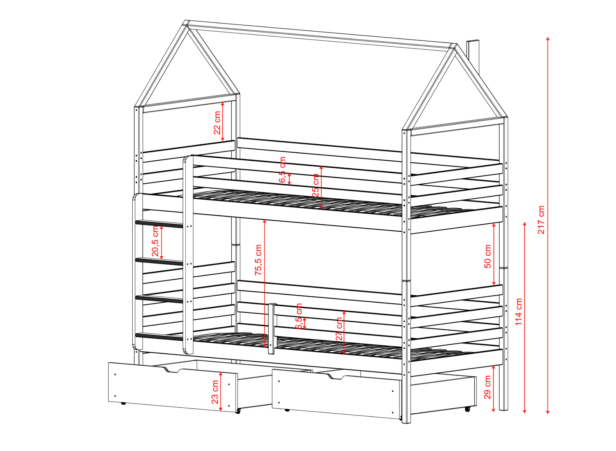 Børnesengen hus ALEX er opfyldelsen af enhver lille barns drømme. Det er en nøje gennemtænkt og omhyggeligt udført konstruktion, der stimulerer kreativiteten og påvirker sanserne. Den store holdbarhed og stabilitet gør det til et børnemøbel, der kan bruges uden problemer i mange år. Vi garanterer også, at hvert barn vil være glad for at have det hver dag. Hos Lano Møbler lægger vi stor vægt på ikke kun det visuelle aspekt, men især på funktionaliteten af børnesenge. Derfor hus-køjesengen ALEX giver ikke kun en behagelig søvn, men også sikker opbevaring af forskellige småting. Under børnesengen ALEX er der praktiske skuffer, der muliggør opbevaring af sengetøj, tøj og mange stykker legetøj. Du vil ikke længere have problemer med ting, der ligger og flyder rundt i rummet. Nu vil der altid være plads til dem.