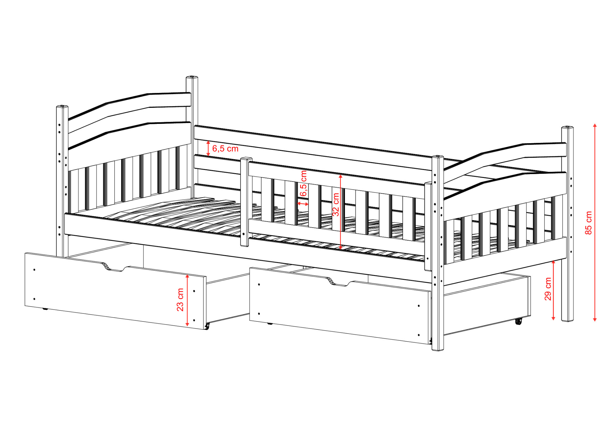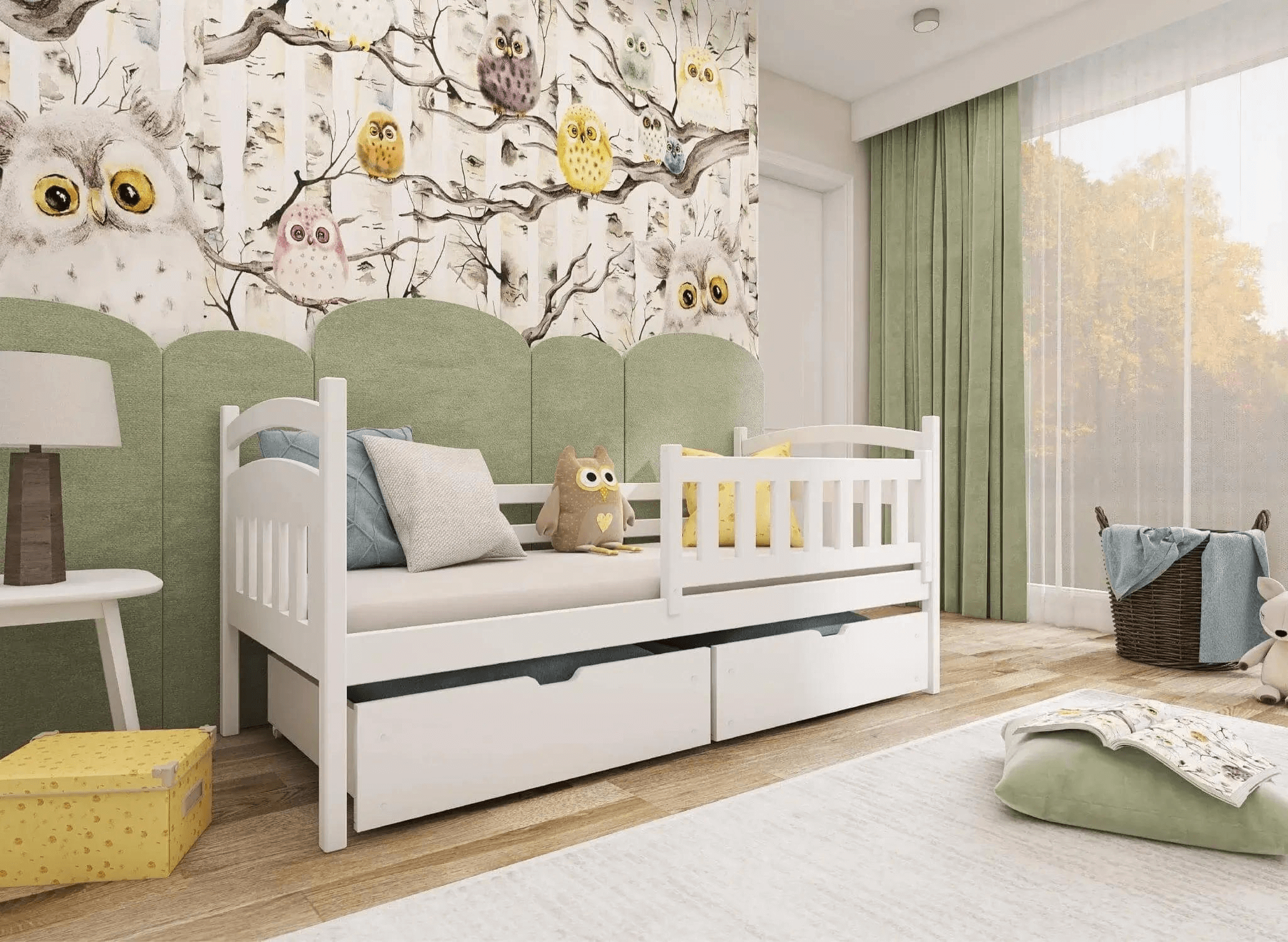 Vi er klar over, hvor svært det kan være at holde orden i børneværelset. Vi vil gerne hjælpe dig med dette gennem det praktiske design af vores møbler. Derfor medfølger der til børnesengen TERRY to skuffer, hvor du kan opbevare sengetøj, tæpper, tøj eller legetøj. Disse ekstra opbevaringsrum aflaster i høj grad barnets garderobe eller kommode, hvilket giver dig mulighed for at udnytte den tilgængelige plads mere effektivt.