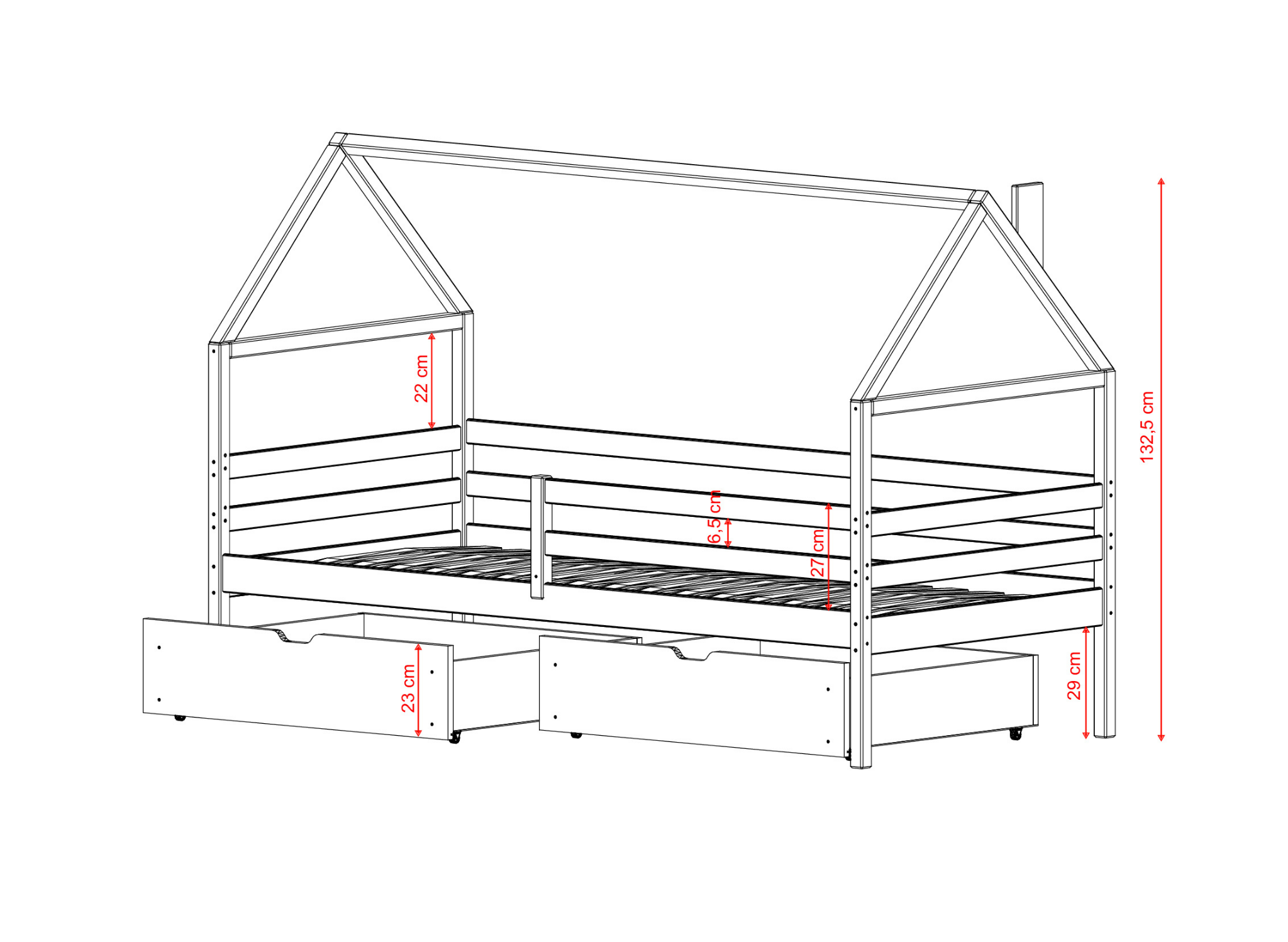 Børneseng i husform ARON fra Lano Meble er opfyldelsen af ethvert barns drøm. Dette møbel er lavet i en form, der vil stimulere ethvert barns kreativitet. Den gennemtænkte konstruktion, høje holdbarhed og stabilitet garanterer mange års problemfri brug og dit barns smil hver dag. Hos Lano Meble lægger vi stor vægt på ikke kun det visuelle, men også funktionaliteten. Børnesengen ARON er ikke kun en behagelig seng, men også en mulighed for opbevaring af forskellige børnetilbehør. Under sengen er der nok plads til at placere 2 rummelige skuffer. Du kan tilkøbe dem, når du konfigurerer produktet. Sjov og komfortabel hvile garanteret.