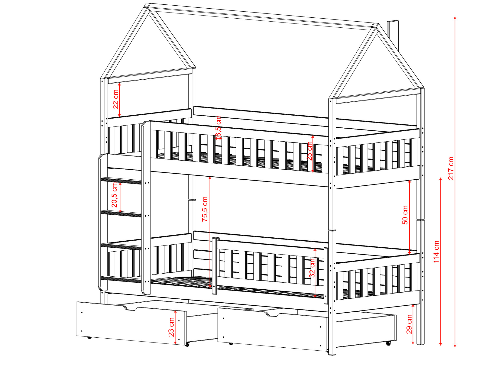Ekstra opbevaringsplads i form af funktionelle skuffer, universelle gelændere og stiger eller endda sikre gummihjul. Alt dette og meget mere kan blive dit, hvis du vælger GAJA køjeseng hus fra Lano Meble. Giv dit lille barn de bedste barndomsår ved at sikre en korrekt og sikker søvn.