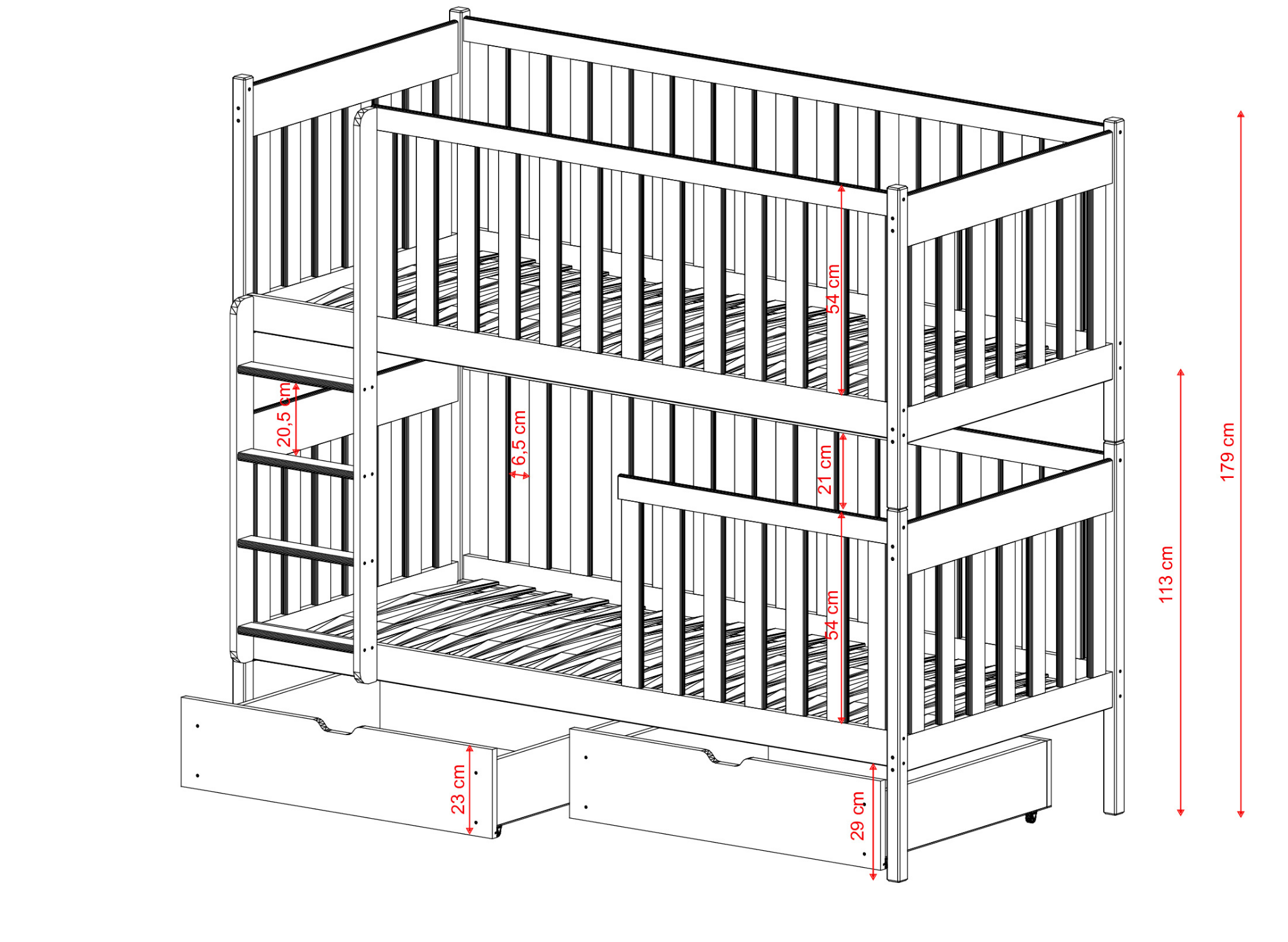 Der tales mere og mere om, hvor vigtigt det er for helbredet at have en god madras til at sove på. Forældre til to børn har ofte en særlig udfordring med at vælge begge madrasser i størrelse og type efter barnets behov. Hos Lano Meble kan du fuldstændig personalisere børnesengen DAWID. Det betyder, at du får den med en perfekt børnemadras, uanset om det er dit barns første selvstændige seng eller om du har en teenager derhjemme. Du kan også bestille køjesengen uden madras, hvis du allerede har en.