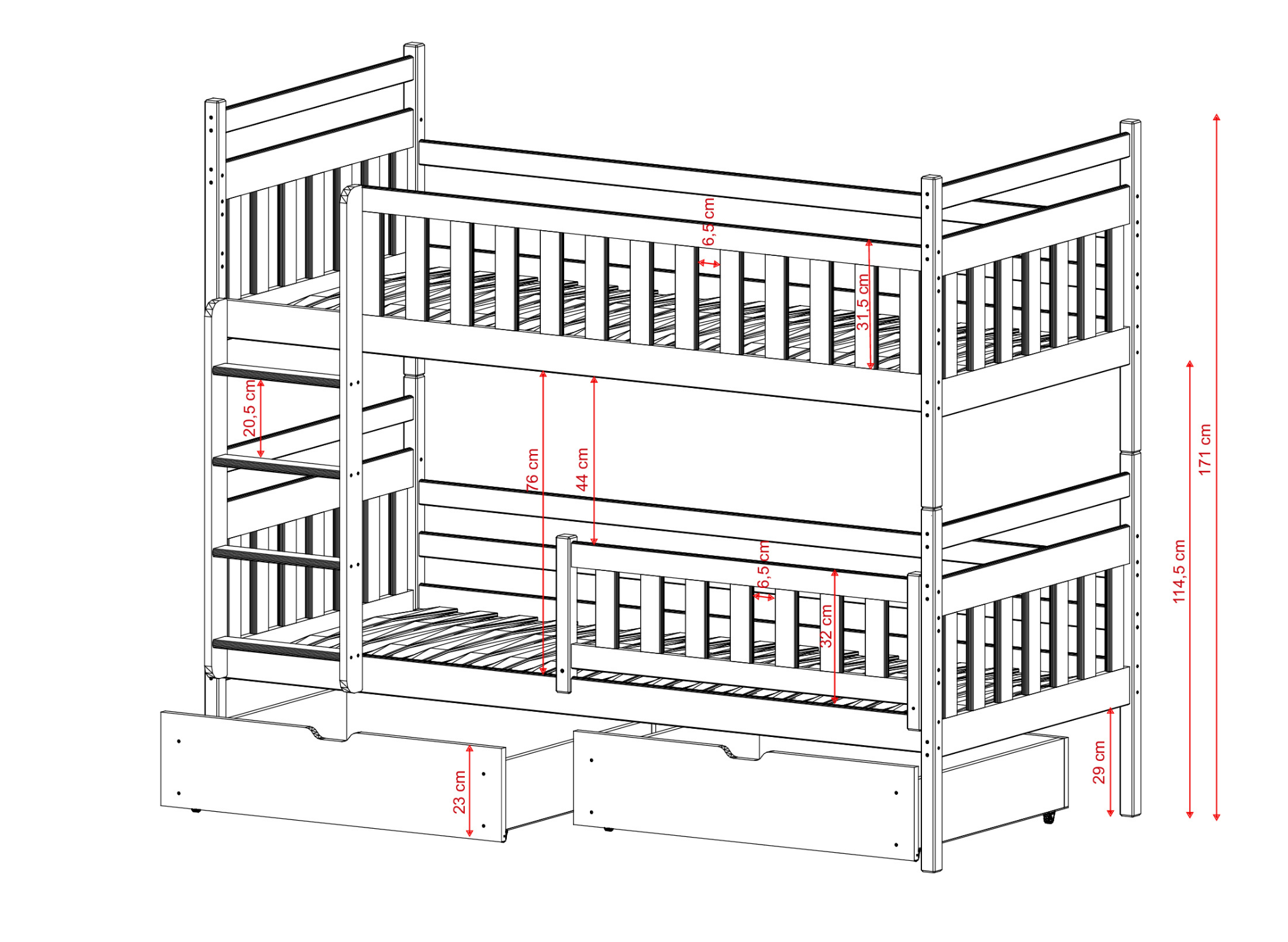Køjesengen MONIKA er en fremragende løsning, ikke kun i små rum, men også i ethvert børneværelse, hvor søskende bor. Hvorfor? En sådan seng stimulerer fantasien og fremmer kreativiteten. Se også på den praktiske side af søskendesengen MONIKA. Begge dele kan adskilles, hvilket skaber to uafhængige soveområder. Når du bestiller vores køjeseng MONIKA, giver vi dig masser af frihed. Du kan tilpasse møblet, så det passer til dine børns behov. Det er dig, der bestemmer, om pladsen under sengen skal være udstyret med to skuffer. Ved bestilling træffer du også beslutningen om, hvorvidt barriererne i køjesengen MONIKA skal være fastmonterede eller aftagelige.
