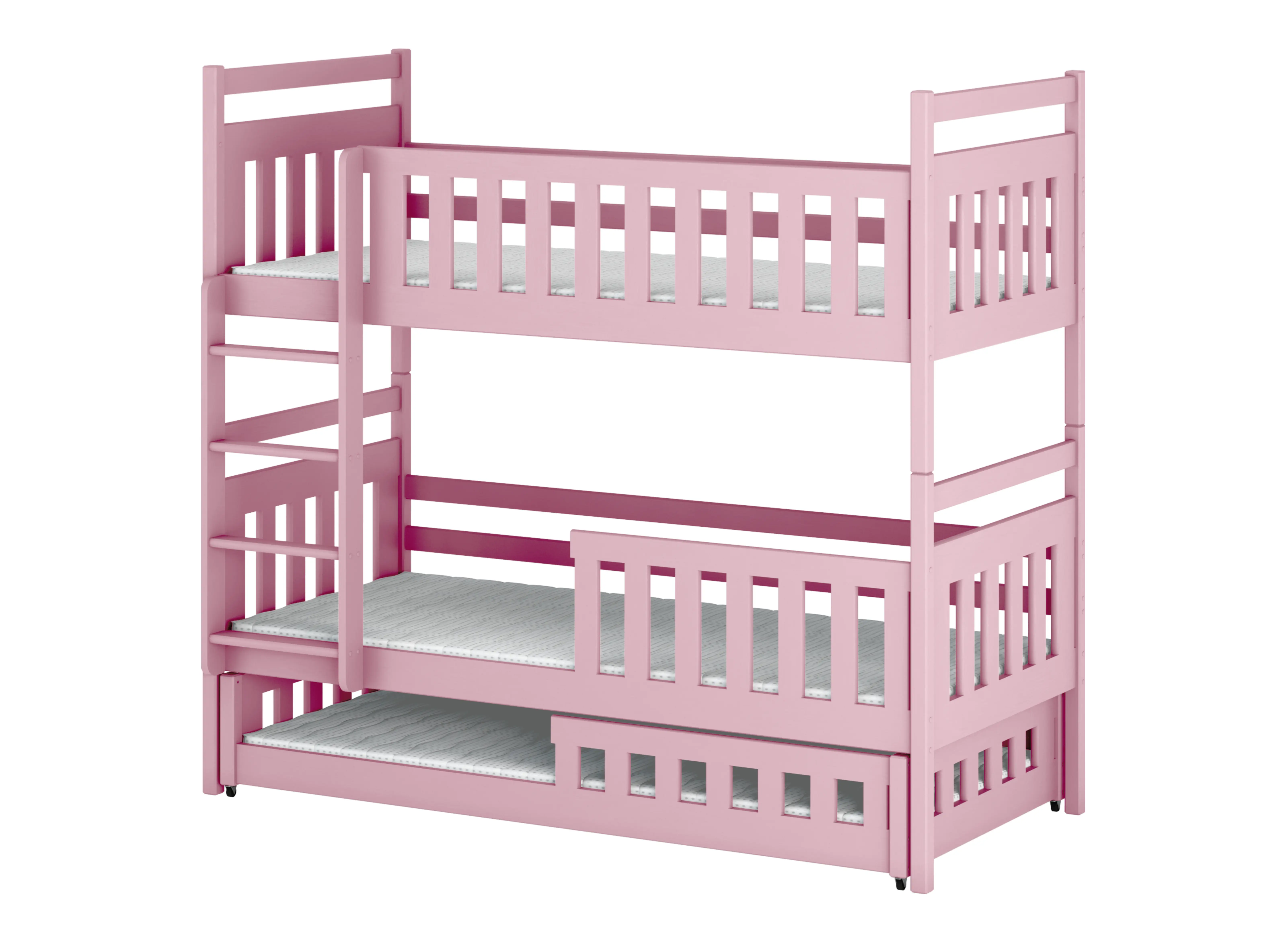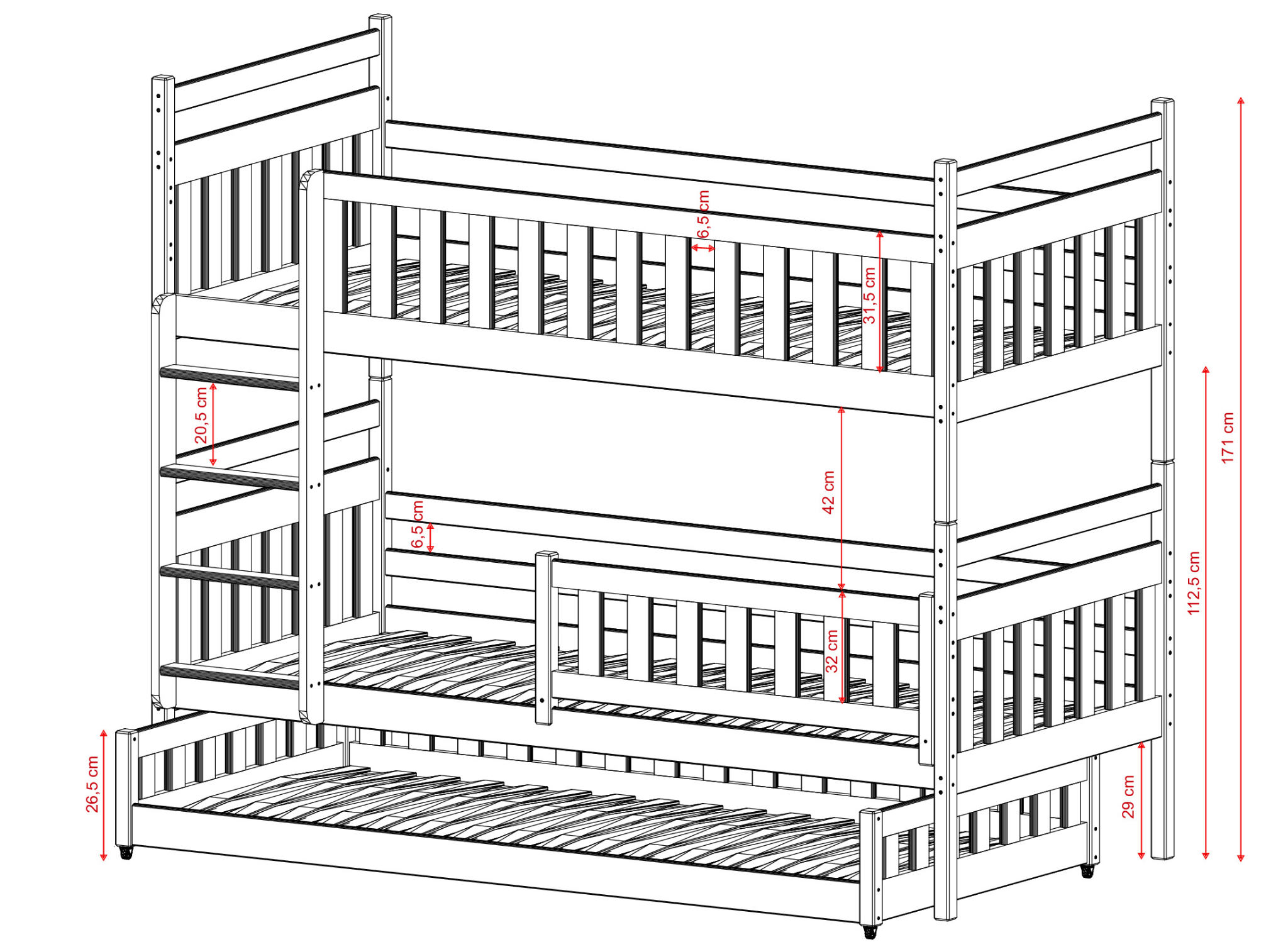 Har du tre børn, der deler ét børneværelse? Leder du efter praktiske løsninger? Hvis ja, har vi lige det, du søger. Vores OLIWIA køjeseng kombinerer to løsninger, der gør det muligt at rumme tre børn. OLIWIA søskendeseng er en køjeseng, der har en skjult udtrækkelig, selvstændig tredje seng i den nederste del. Når du vælger vores OLIWIA køjeseng, bestemmer du, hvordan de sikre barrierer skal monteres, samt hvilken type madras der passer bedst. Med denne tilpasning kan du nemt justere OLIWIA køjesengen til ikke kun dine børns alder, men også til deres behov og fysiske egenskaber.