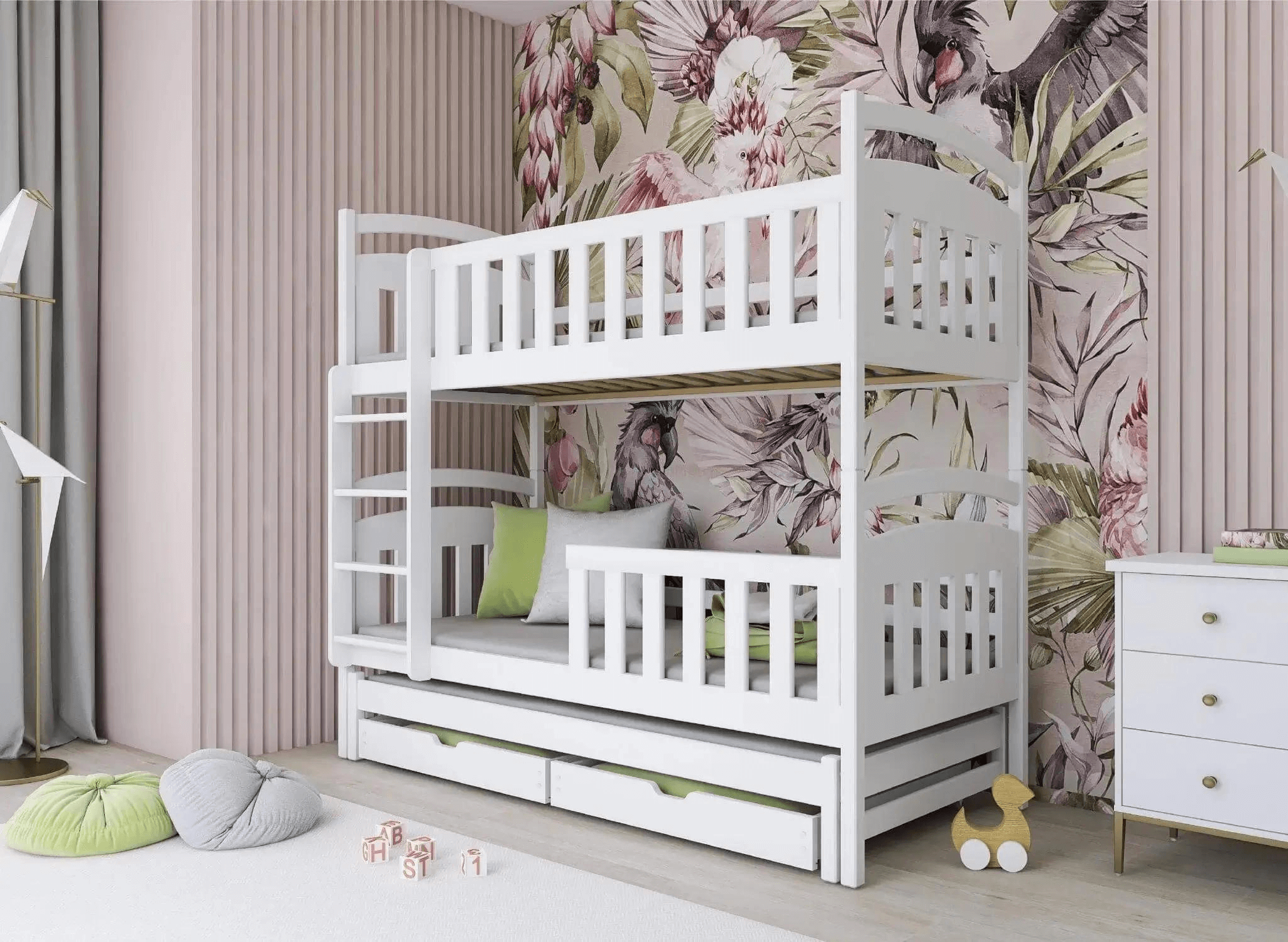 Køjesengen VIKI er lavet af fyrretræ, et materiale, der er holdbart, modstandsdygtigt over for mekaniske skader og tung belastning. Konstruktionen af søskendesengen VIKI er derfor yderst solid. Derudover er det en seng med skuffer, som giver ekstra opbevaringsplads til f.eks. sengetøj eller legetøj.