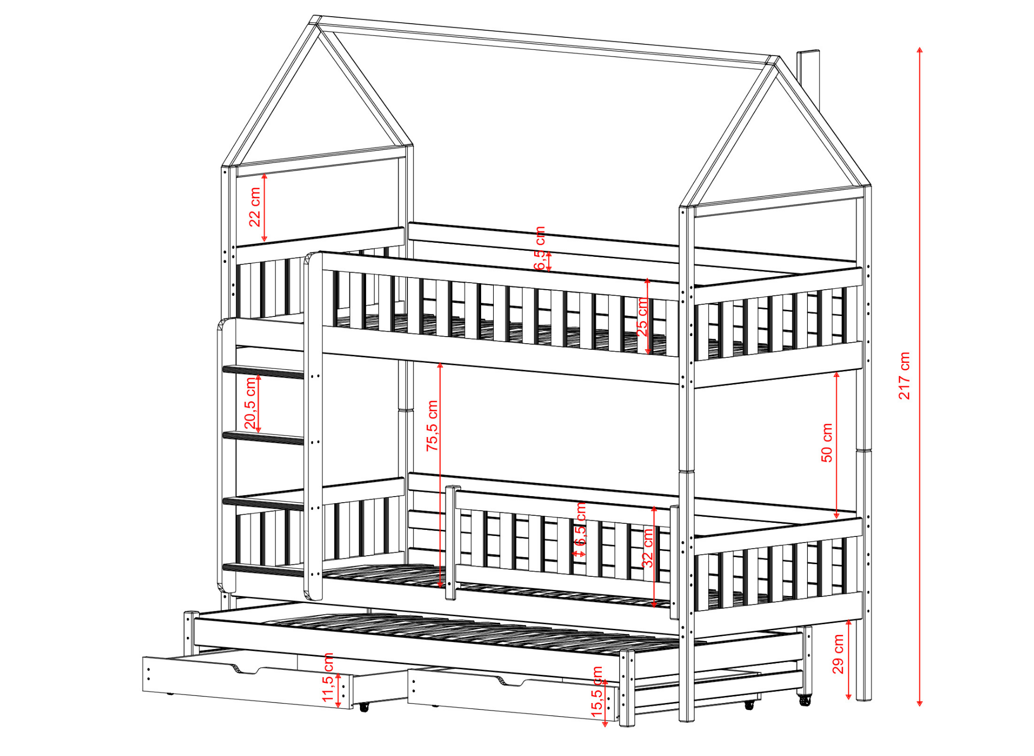Før du køber en køjeseng til dine børn, skal du sikre dig, at den er holdbar og stabil. Hos Lano Meble prioriterer vi dit barns sikkerhed, og derfor er IGA husseng lavet udelukkende af solidt fyrretræ og udstyret med øvre og nedre gelænder. Trinene på stigen er brede nok til at sikre komfort for barnet, når det klatrer op til øverste etage. Rammen under madrasserne er lavet af birkelameller af typen FLEX, hvilket giver børnene en behagelig og langvarig søvn.