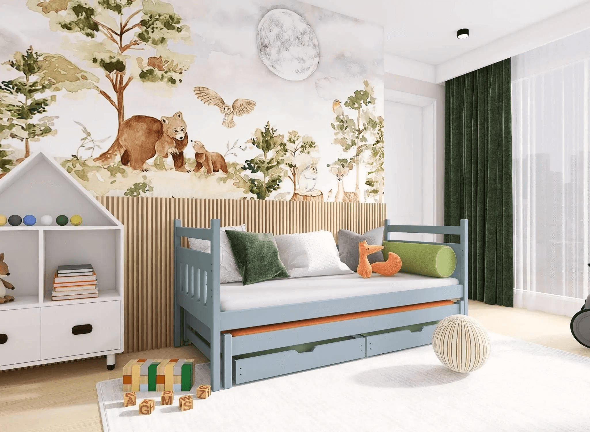 Køjesengen DANIEL er den ideelle løsning til et barn. Denne model giver en unik atmosfære, er fremragende fremstillet og funktionel – vi har taget hånd om de mindste detaljer. I vores dobbeltseng DANIEL kan den anden madras nemt trækkes ud. Børneværelset vil få meget ud af dette møbel. DANIEL er også en seng med skuffer – vi har brugt solide træbarrierer. Denne model ser original ud og passer perfekt både i en drengs og en piges soveværelse. Mange elementer kan yderligere konfigureres. Det er værd at nævne, at vi har fremstillet børnesengen DANIEL af solidt fyrretræ. Den har barrierer, der sikrer barnets sikkerhed. Derudover er det en seng med skuffer, hvor man kan opbevare legetøj eller blot puder, sengetøj og dyner. Vi har brugt en ramme med FLEX-birkelameller, hvilket garanterer den højeste komfort for dit barn.